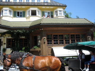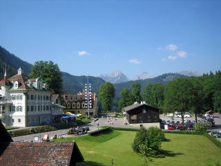 11:05 ホーエンシュバンガウ城内の観光が終わり、ホテルの近くまで戻ってきました。 (お城の内部は撮影禁止ですので、残念ですが写真はありません) こうして眺めてみると、日本の高速道路のインター近くにあるラブホテルの様に見えます。 (すみません、例えが悪くて。きっと日本のラブホテルは、こうゆうのをモデルにデザインしているんでしょう) |