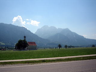 13:06 テーゲルベルグ山頂からロープウエイでシュバンガウ村に下りてきました。 「地球の歩き方」に出ていた写真スポットで写真を一枚。 ドイツアルプスとノイシュバンシュタイン城をバックに聖コロマン教会です。 やはり、かすみがかかっていて、お城はどこだか見えませんね。 これから、シュバンガウ村を後にして、フュッセンの町に向かいます。 |