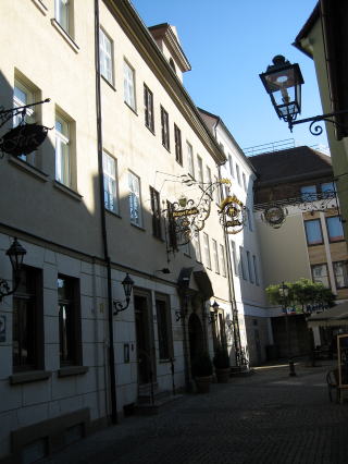 18:34 マルクグラーフェン城の近くにある、狭い通りを入ったところに今夜の宿泊先”hotel burger Palais”はありました。(写真中央の2階の壁から、飾りの看板が出ているところがホテルです) このホテルの宿泊料は朝食付きダブルで1室、114ユーロ=約15,000円です。 |