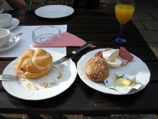 7:41 朝食は、パンとチーズとハムそれにゆで玉子、飲物はコーヒーとオレンジジュースなどです。 パンはドイツのどこに行っても、あるじは美味しいと感じました。 ヨーロッパのパンが美味しいのは、一つは乾いた空気、もう一つは土壌(小麦が育つ土壌であり、ミネラル分の多い水)だと、とある有名らしい(あるじは知りませんが)日本のパン屋さんが言っているのをラジオで聞いたことがあります。 |