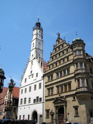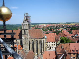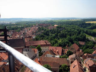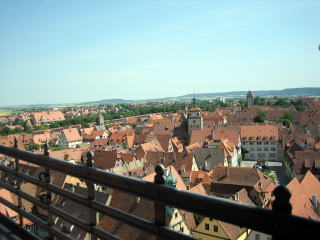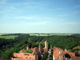 塔の上からの景色です。 塔の上に登ると、ローテンブルグの町が緑の中に浮かんだ、島の様な町だと言うことが良くわかります。 |