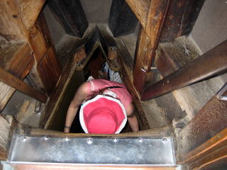 エレベータはありません。 ひたすら、階段と言うか、はしごを登ります。 しかも、こんなに狭いところもあります。 だれか人が上り下りをしていると、待っていなければなりません。 |