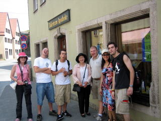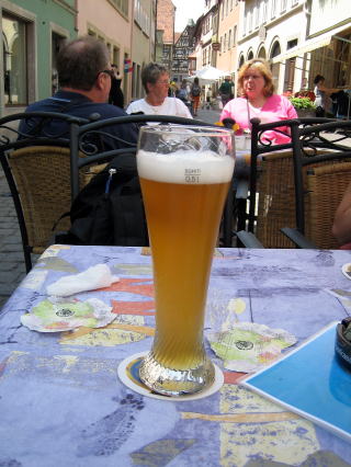 13:07 ローテンブルグの町の中で、少し遅い昼食を取ることにしました。 「まずはビール」と言いたいところですが、あるじは運転があるので遠慮しました。 ビールは嫁と姉が注文。ビール一杯2.90ユーロ=約400円です。 ちなみに、あるじが頼んだのはコーラ。一杯3.40ユーロ=460円。この価格設定、日本人には理解できません。 このビール、20年くらい飲み続けると、うしろの様になってしまうんでしょうか。(失礼) |