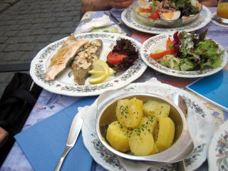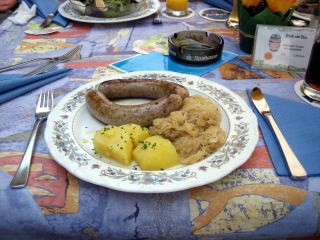 13:19 あるじが注文した、ソーセージとザワークラウトそしてポテトの付け合わせです。 何だかんだで、ドイツに来てからこれまでソーセージを食べ損ねていました。 7.30ユーロ=約980円。安くはないですね。特にここローテンブルグは観光地なので、割高だと思います。 |