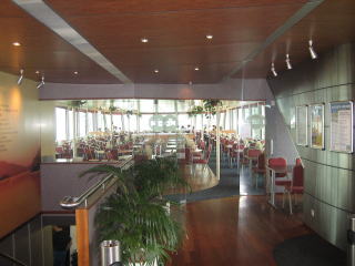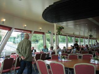8:29 遊覧船の中はこんな感じで、展望レストランになっています。 室内にいたければ、コーヒー一杯で出発から終点まで居座っていても何の問題もありません。 当日はマインツから乗ってくるお客さんはほとんど居ず、ごらんの通りガラガラの状態でした。 |