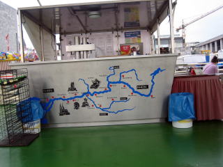 9:02 早速、次の停船場に着きました。 その後、川下りのトピックスが多い中央部分に行くまでに、次々とお客さんが乗ってきて、最終的にはほぼ一杯の状態になり、トピックスの箇所を過ぎると、だんだんと降りていきました。 |