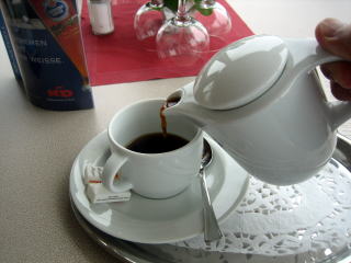 9:32 船はまだまだ市街地を下っており、景色が少々退屈なので、コーヒーブレイクにしました。 ドイツではコーヒーを注文すると大抵、この様なポットで出てきます。 1ポット=3.6ユーロ=約480円。 カップでも注文出来ます。カップ1杯で注文すると1.8ユーロ=約240円 ドイツのコーヒーはアメリカと違い、やや濃いめ日本人好みの濃さです。 (最近はスターバックスに代表されるアメリカのコーヒーも濃くなりましたが・・・) |