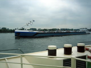 9:50 遊覧船は時々、コンテナや車を積んだ貨物船とすれ違います。 貨物船は川専用で、横波による転覆の可能性がないのと川幅の狭いところもあるからかもしれませんが、長さの割に幅がやたらと狭い見慣れない形をしています。 ライン川を貨物船が行き来していることは、海上交通が近隣の人々の生活を支えていることが想像でき、ドイツの人たちにとって重要な役割を果たしていることがうかがえます。 |