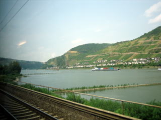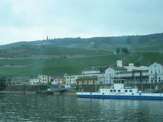 10:31 小一時間が経ち、周りの景色は市街地からブドウ畑へと変わってきました。 この先、コブレンツまで行くと、ライン川はモーゼル川と合流します。 この地域はドイツワインの生産地として有名な地域です。 |