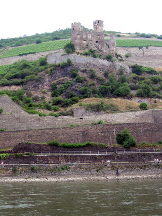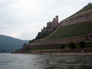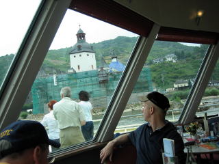 10:45 川下りの途中、両岸にたくさんの城を見ることができます。 船から眺めているときは、船内にガイドが流れることもあり、次々と現れる城に、「へぇ〜」とか「ほぉ〜」とか言っていますが、ドイツの人には悪いのですが、一つ一つ、名前を書いて、由来を書いても読む方も退屈、書く方も退屈なので省略します。 これら両岸の城は、中世の昔から長い間ライン川を挟んで、違う民族同士にらみ合いを続けていたために出来たものです。 |