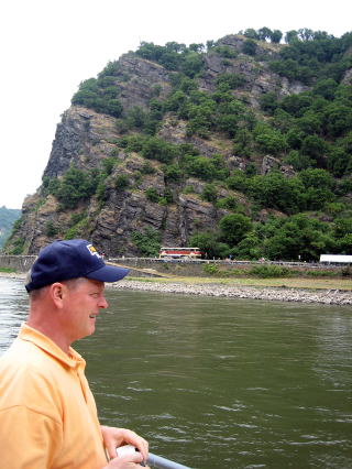 12:06 ライン川下りの目玉、ローレライの岩山です?って。 言われなければ、決して気がつきません。 この岩山は川に突き出た形になっており、川幅が狭くなっていることから、昔は船が良く座礁したり、沈んだりしたそうです。 エンジン付きの船が当たり前の昨今では、何事もなく通過してしまいます。 |