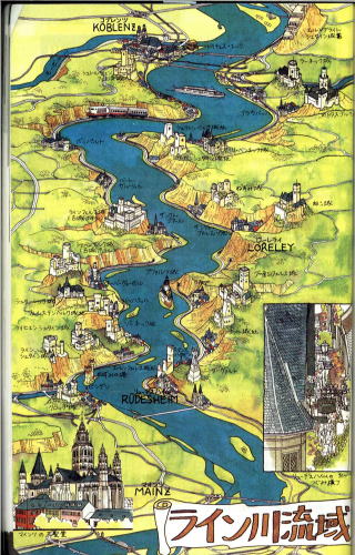 ライン川の川下りは、左の写真にあるとおり、左下のマインツを出発して、コブレンツまで下る旅程です。 途中、両岸にはさまざまな城や街、ブドウ畑が広がっています。 時刻表にあるように、遊覧船は途中何カ所かの停船場に停まりながらライン川を下っていきます。 |