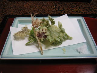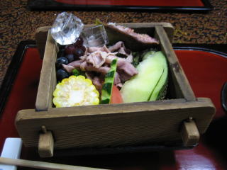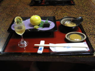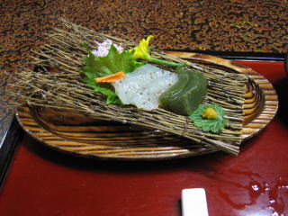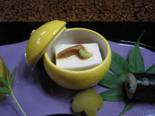真ん中は、「ごま豆腐」 上に乗っているのはヤマメ(?)の卵の塩漬けです(なかなか珍味です) |