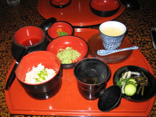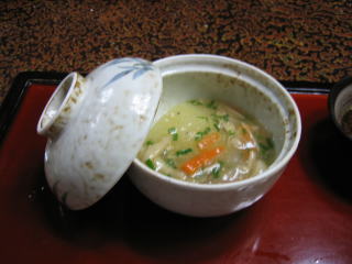 最後に「おそば」と「炊き込みゴハン」「茶碗蒸し」に「お吸い物」です。 炊き込みゴハンはお代り出来ます。 |