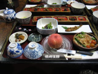 明けて、朝食です。 ど〜んと、桃。丸ごと一個。美味しいけれど、あるじとしては剥くのが面倒。 下手くそなので、手がべとべとになってしまいます。 |