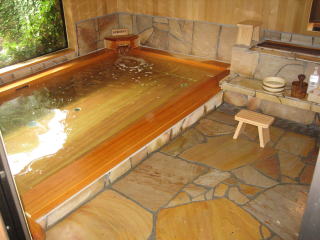 風呂です。 最近作り替えたらしく、檜の匂いでいっぱい、いい匂いです。 宿も大きくないですが、4〜5人で一杯くらいの大きさです。 お湯は鉱泉ですので、沸かし直しになります。 |