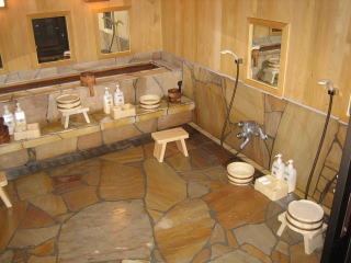 洗い場です。 外には、露天風呂がありますが、他の人が入っていたため、写真は撮れませんでした。 大きさは、室内と同じくらいです。、眼下に河原を望むことが出来ます。 |