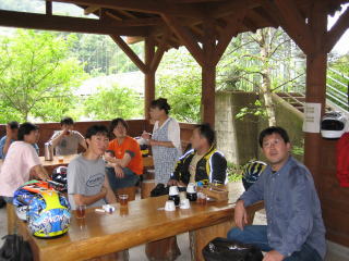 上の写真の建物がお店ですが、中はほとんど調理場になっており、あとは6人がけテーブルが2つだけです。 お店の周りには、左の写真の様な屋根付きのベンチ?(これ何と言うのか分かりません。わかる人教えてください)で食事が出来ます。 注文はお店に入って、右側にある自動販売機で食券を買います。(ちょっと風情がありませんネ) みんなそろって、外でごはんです。 |