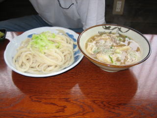 肉つけうどん(名前忘れました) うどんは冷水で締めてあり、暖かいつゆにつけて食べます。 並400円、大盛り500円だったかな? |