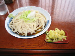 あるじが注文した「大盛り冷やしタヌキ」。 冷やしタヌキと言っても、揚げ玉はのっていません。 揚げ玉は各テーブルに置いてあるので、自分で好きなだけかけます。 あと、これにお好みで自家製の七味をかけて食べます。 これで、400円、駅の立ち食いうどん並の金額で、腰のあるうどんを食べることが出来ます。 右下は自家製の漬け物、一人一回盛りっきり。1時も半を過ぎると無くなっていることがあり、貧乏性のあるじとしては、すごく損をした気分になります。こちらも、ちょこっとピリ辛。 |