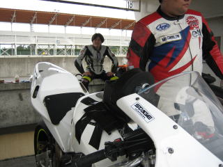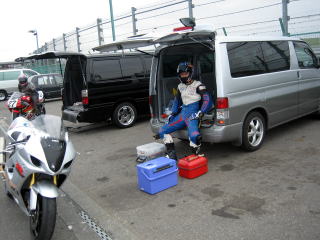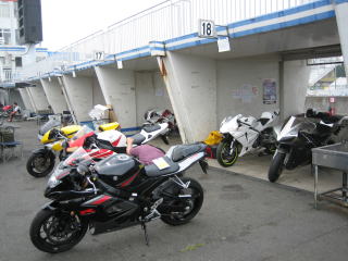 朝礼(ライダースミーティング)のある風景。 参加する人は、サーキットのライセンスを持っていない人が多いので、簡単にサーキット走行の仕方やフラッグの説明などを受けます。 すーさん、眠そーです。 「気合いだー!」って あるじは一度で良いから、やる気のあるすーさんを見てみたい。 |