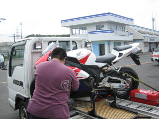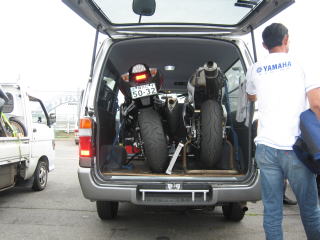 終了ー。積みます。 GSX-RとCBRの2台、ちゃんと詰めます。 |
