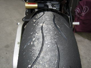 同じく、55周(2km×57=114km)走行しました。(そりゃそうだ) フロントはリヤほどグリップ感うんぬんはありませんでした。しっかりしてます。 ただし、最終コーナーの立上がりで、ラインを外すとちょっとバタバタ感があります。 ただ、安定しているので、すぐにスライドするとか言うレベルではありません。 路面の状態なのか、タイヤ自体なのかは、不明です。 この位のタイムで筑波を走る限り、フロントの方がライフが短そうです。 (当然、ライディングスタイルに依存しますが) |