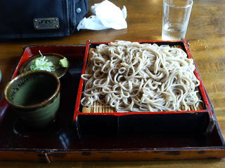 メニューはもりそばのみ。並盛りと大盛りがあります。 もりそば(並)1,000円なりを注文しました。大盛りはなんと1,700円!、もりそばに\1,700を投資する度胸がありませんでした。 もりそばが出てきました。確かに手打ちのようです。 盛りが多いように見えますが、ざるが上げ底です。(笑)蕎麦に隠れている中央部分が盛り上がっています。こんな形のザルは初めて見ました。 味のコメントは控えさせていただきます。 (-_-;) 日本中にはたくさんのそば屋さんがあります。次回、野沢温泉に来ることがあったら、他の味を探求したいと思います。 |