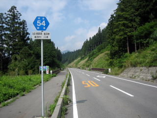 午前8:43 県道54号線を西進します。 写真の様に、快適な道が続きます。標高もそこそこあるので、気温も快適です。 「やっぱ、ツーリングはいいね〜」 |