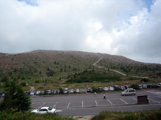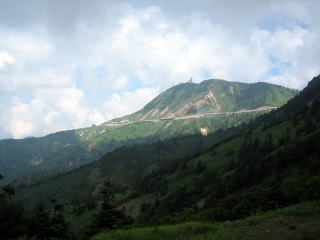 この向こう側が白根山の湯釜になります。 写真では登山道しか見えませんが、観光客が一列にならんで、湯釜を目指して登っていきます。傍から見ているとまるで”蟻んこ”の行列です。 ちょっと見に行きたかったのですが、”奥志賀林道”が待っていますので、写真撮影だけで先を急ぎます。 |