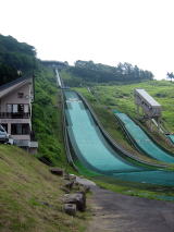 午後0:34 野沢温泉に到着 やっと、野沢の温泉街に到着しました。この林道、走破するのに1時間はかかりますね。 写真はジャンプ台。目の前にするとすっごく大きいです。 |