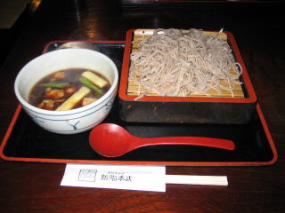 あるじが頼んだのは、「鴨汁そば」です。 初日にも頼みましたが、鴨はあるじの好物です。(^o^) そばは昨日、おとといと食べたそばより細くはなりましたが、やはり田舎風の太めで、このお店の場合、偏平で断面の形はきしめんに似ています。麺が細くなった分、長くなりました。(笑) |