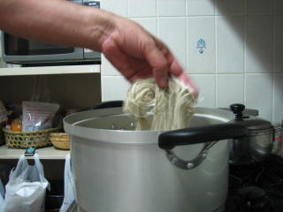 茹でます。 1人前=120gづつ、茹でます。 ゆで時間は35秒にしました。 |