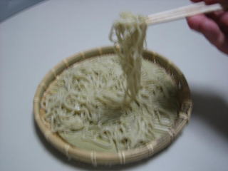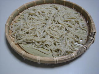 出来上がりました。 新そばらしく、緑が濃いきれいな色をしています。(^o^) (写真だと難しいですね) |