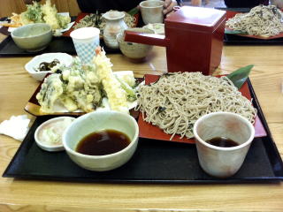 あまりそば自体に期待をしないのもあり、普通であれば頼む”せいろ”をやめて、お腹の膨らむ”天ざるそば”の大盛りを注文しました。 写真手前はあるじが注文した”天ざるそば 大盛り”で、向こう側は”普通盛り”です。 普通盛り、大盛りとも盛りは十分にありました。 注文したのは”天ざる”ですが、上に海苔が乗っていないような・・・・・ 「すみません。また写真を撮る前に忘れて、ひとくち食べちゃいました」 さて、”みのり”のそばですが、「予想していたより悪くないな」と言うより、結構行けます。 ひとくち食べるとそばの香りが広がり、味もしっかりしています。美味いです。ここは当たりですね。 先入観で判断してすみません。 天ぷらは、エビ、山菜類、キノコと盛りだくさんで、全体として軽く揚げてありました。 油の香りは弱く、山菜やキノコの天ぷらは味が活きて美味しいのですが、エビの天ぷらについては、もう少し揚げて油の香ばしさがあった方があるじとしては好みです。 「お勘定、お願いします!」 天ざるそば、普通盛り1,370円、大盛り+210円 味、量ともにこの値段でしたら、パフォーマンスは高いと思いました。 |