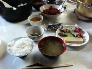 6:42 朝食です 山小屋の朝は早い。 そう、早いんです。6時半から朝食です。 後から行こうと思いましたが、さっさと済ませて欲しいと言うことで7時前から朝食です。 朝食は昨日の夕食に輪をかけて”質素”でした。(笑) (山小屋で豪華な食事を期待してはいけません) |