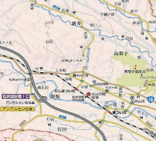 地図上部の県道33号線から松井田方面に下りて来ました。 国道18号を過ぎて、上信越自動車道の松井田妙義インターで乗るには、”右折”しなけらばならなかったのですが、間違えて”左折”してしまいました。 結局、上信越道には乗れず、そのまま、国道18号線を高崎まで走ることに。 |