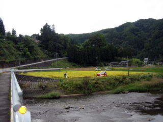 12:01 国道の脇では、黄金色に輝く稲の刈り入れをしていました。 どこにでもある日本の里山の風景です。 この風景はいつまで見ることができるのだろうか。 |