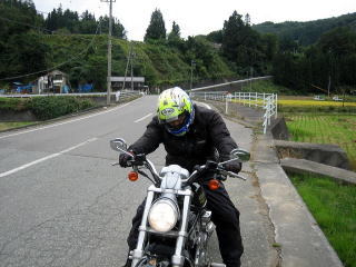 12:05 5分ほど待って、男レーシングさんが到着しました。 鬼無里街道のタイトコーナーはVロッドには厳しいですね。 ガックリと肩が落ちていますょ。 |