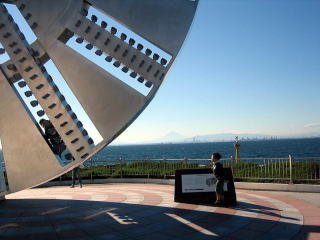 海ほたるに展示してあるシールドマシンの刃(左の巨大な丸いもの)と遙か遠くに見える富士山。