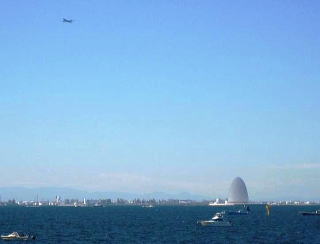 東京湾上にポッカリ浮かぶアクアトンネルの川崎人工島にある換気塔や羽田空港を飛び立った飛行機のバックに東京の都心がよく見えます。