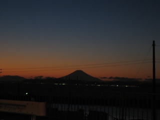 途中の車窓から、東京湾を挟んで、沈む夕陽に浮かぶ富士山。