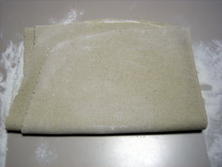 加水率45%ぐらいでのやや固めで”こね”を終えて、まとめました。 まとめは”究極のそば粉”と比較して、若干まとまりにくい様です。 二八と言うことで、割れもほとんどなく、”たたみ”までできました。 麺体は写真でもわかるほど緑色、期待出来そうです。 麺体の中には、適度に"星”が入っています。 |