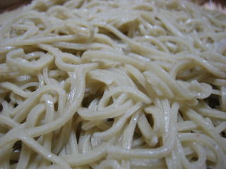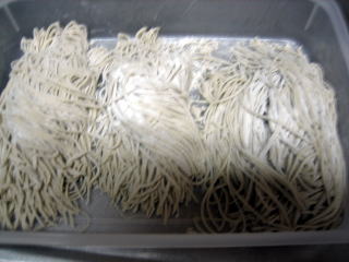 切り終わりました。 麺が切れることもなく、切ることが出来ました。 やはり、二八は生粉打ちに比べると、楽です。 |