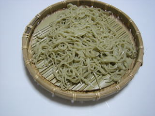 茹でて、出来上がりました。 非常に緑の濃いきれいなそばが出来ました。(^o^) 今回のは写真でもわかると思います。 |