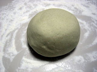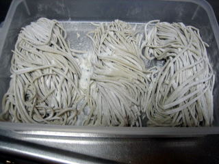 水は48%ぐらい入りました。 ちょっと、入れすぎ、多加水気味で、やや柔らかめの麺体になってしまいました。 そば粉自体に、かなり粘りけがありましたので、まとめ易いです。。 まとめた麺体は、表現は悪いですが、まるで小学校の時に遊んでいた、”油ねんど”の様な色です。どちらかと言うと、田舎そばっぽいです。 |