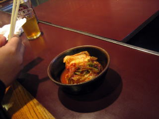 まずは、キムチ。 男レーシングさんが飲んでいるのは、もちろん、バイクで来ているので、ウーロン茶です。 |