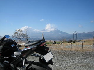 12:43 御殿場からの富士山 昼食も終わり、小羽根山から2,3分バイクを走らせ、富士山をバックに記念撮影。 今日は天気は良いのですが、湿気が多いようで、富士山にあたった西からの風が雲となり富士山山頂を隠していました。 |