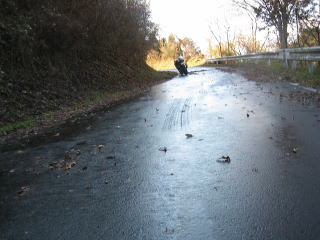 13:37 路面は完全に凍結してました。 気温は暖かいが、路面は冷たかった。 そう言えば、TL時代にも水上ツーリングで雪の中転倒した記憶がよみがえってきました。 |