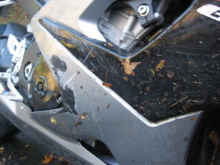 13:37 右側のカウルがぎったぎった。落葉も張り付いています。 前回、エビスでは左側だったのに、今回は右側。 これで、両側傷物です。(T_T) |